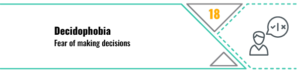 Decidophobia is a fear of making decisions. Making any kind of decision can seem impossible for someone with decidophobia, as they do not trust their own opinions. A person with decidophobia may excessively rely on others to help them with decision-making. They may even turn to external sources, such as astrology, for advice. Decidophobia could be part of a largermental health disordercalleddependent personality disorder. One of the symptoms of dependent personality disorder is relying on others to make decisions.
