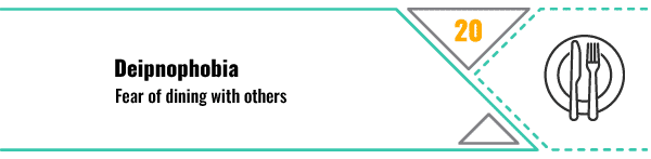Deipnophobia is a fear of dining with others. This often manifests as a fear of dinner parties and may stem from a fear of dinner conversations or having to carry out a conversation while eating. It may be related to an underlying social phobia. In many cases, deipnophobia is triggered by traumatic events from an individual’s past, such as being ridiculed as a child for the way they ate or for not following proper etiquette at the dinner table.