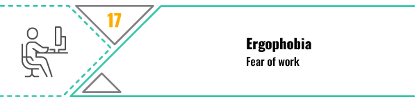 Ergophobia is a fear of work. People with ergophobia tend to have extreme anxieties associated with their place of work or work environment. Some may have a fear of manual labor or the act of working itself, while others can have a fear of finding a job. All of these cases would be classified as ergophobia.