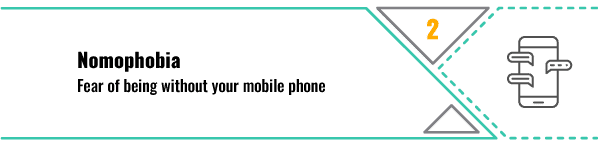 Nomophobia is the fear of being without your mobile phone. People with nomophobia experience excessive anxiety about not having their phone with them, their battery being low or their phone being out of service. Regardless of the circumstances, not being able to use their phone causes people with nomophobia to become panicked and experience extreme symptoms of anxiety.