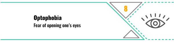 Optophobia is a fear of opening one’s eyes. This fear can be extremely debilitating, as it is hard for an individual to carry out daily activities without opening their eyes. People with optophobia may prefer to stay indoors or in dimly lit areas. This phobia is usually associated with ageneralized anxiety disorder. Like many other rare phobias, this fear is usually the result of a traumatic incident.
